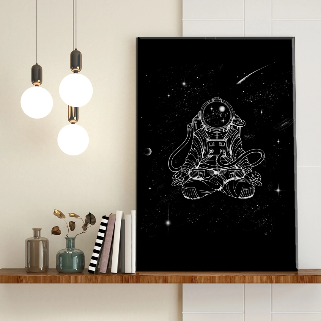 Transforma tu espacio con esta fascinante ilustración que combina la exploración espacial con la paz interior. Este diseño minimalista presenta a un astronauta en posición de loto flotando en el cosmos, creando un contraste perfecto entre la tecnología y la espiritualidad. Ideal para decorar estudios, salas de meditación, habitaciones juveniles o espacios de trabajo creativos. El estilo de líneas blancas sobre fondo negro aporta elegancia y modernidad a cualquier ambiente. Perfecto para quienes buscan inspiración, tranquilidad y conexión con el universo infinito. Una pieza decorativa única que invita a la reflexión y al asombro por el cosmos.