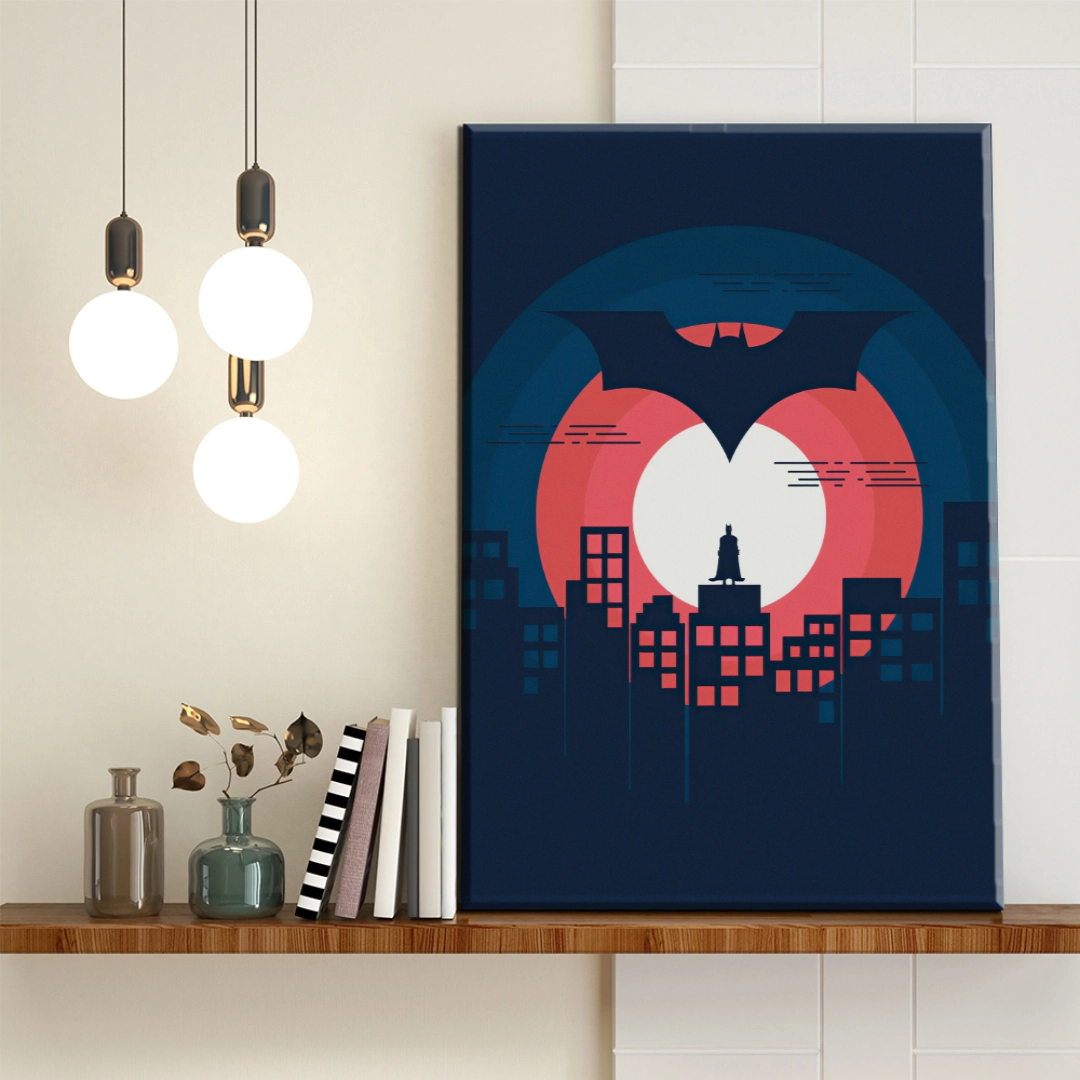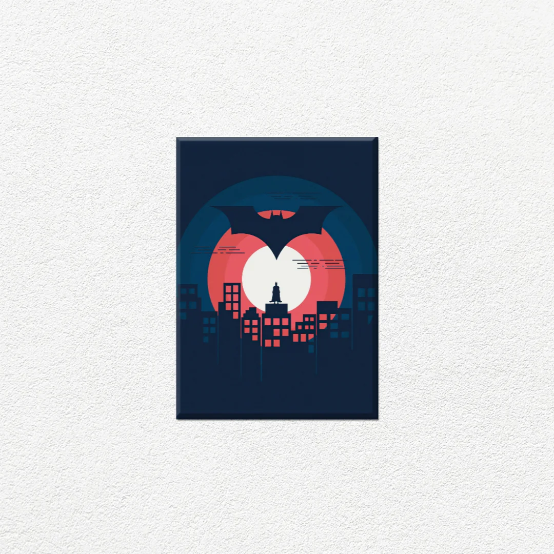 Transforma tu espacio con esta impresionante representación del Caballero de la Noche. Este cuadro decorativo captura la esencia de Batman en su rol de protector de Gotham City, con un diseño minimalista y contemporáneo que combina tonos coral, azul oscuro y detalles en blanco. La composición circular y la silueta icónica del héroe sobre los edificios crean una atmósfera nocturna llena de misterio y poder. Perfect para fanáticos del universo DC y amantes del diseño moderno, este cuadro añadirá personalidad y estilo a tu sala, oficina o habitación. La paleta de colores cálidos y fríos genera un contraste visual impactante que captura la atención inmediatamente.