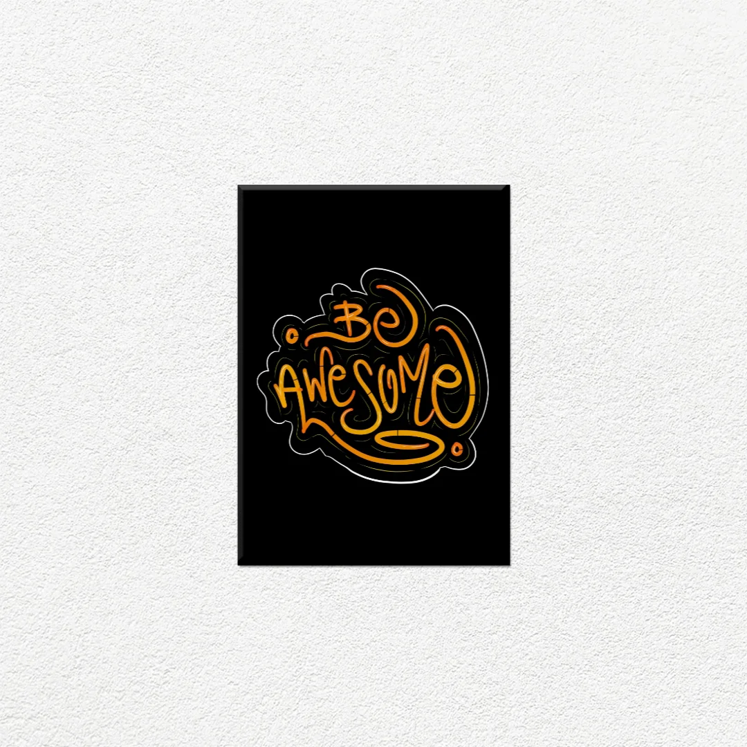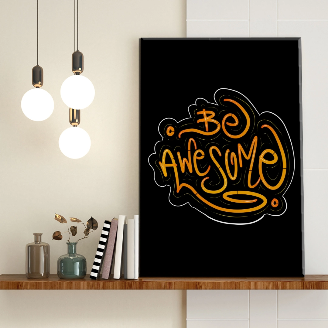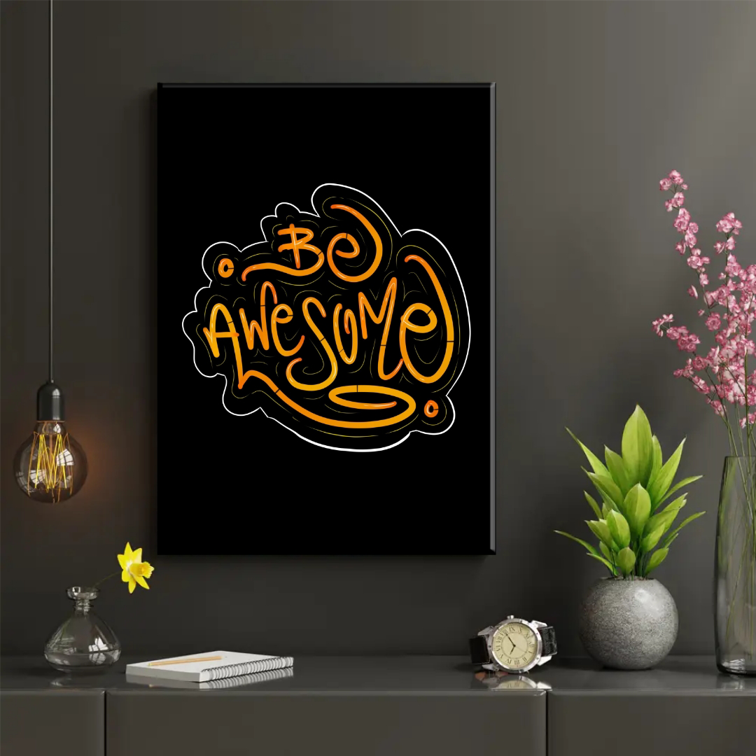 Transforma cualquier espacio con este vibrante diseño tipográfico que proclama Be Awesome. Perfecto para tu oficina, habitación o estudio, este cuadro decorativo combina letras estilizadas en tonos naranjas y amarillos con trazos fluidos y dinámicos que transmiten energía positiva. El contraste del fondo negro resalta la intensidad de los colores, creando un impacto visual inmediato. Ideal para quienes buscan decoración moderna con mensajes inspiradores que motiven día a día. Este diseño contemporáneo se adapta perfectamente a espacios juveniles, áreas de trabajo creativo o cualquier ambiente que necesite un toque de inspiración y personalidad. Una pieza que no solo decora, sino que también comunica actitud y determinación.