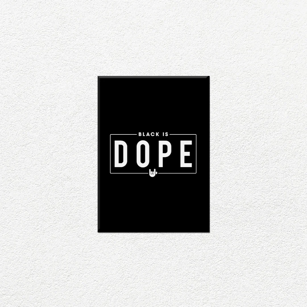 Este cuadro decorativo presenta un diseño tipográfico audaz y contemporáneo con el mensaje Black is Dope. Su estética minimalista en blanco y negro lo convierte en una pieza perfecta para espacios modernos, juveniles y urbanos. Ideal para decorar habitaciones, estudios, oficinas o cualquier ambiente que busque un toque de personalidad y actitud. El contraste marcado entre el negro profundo del fondo y las letras blancas en negrita crea un impacto visual inmediato. El símbolo de la mano añade un elemento de cultura urbana y contemporánea. Una declaración de estilo que celebra la individualidad y la confianza.