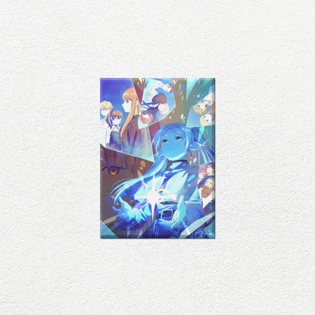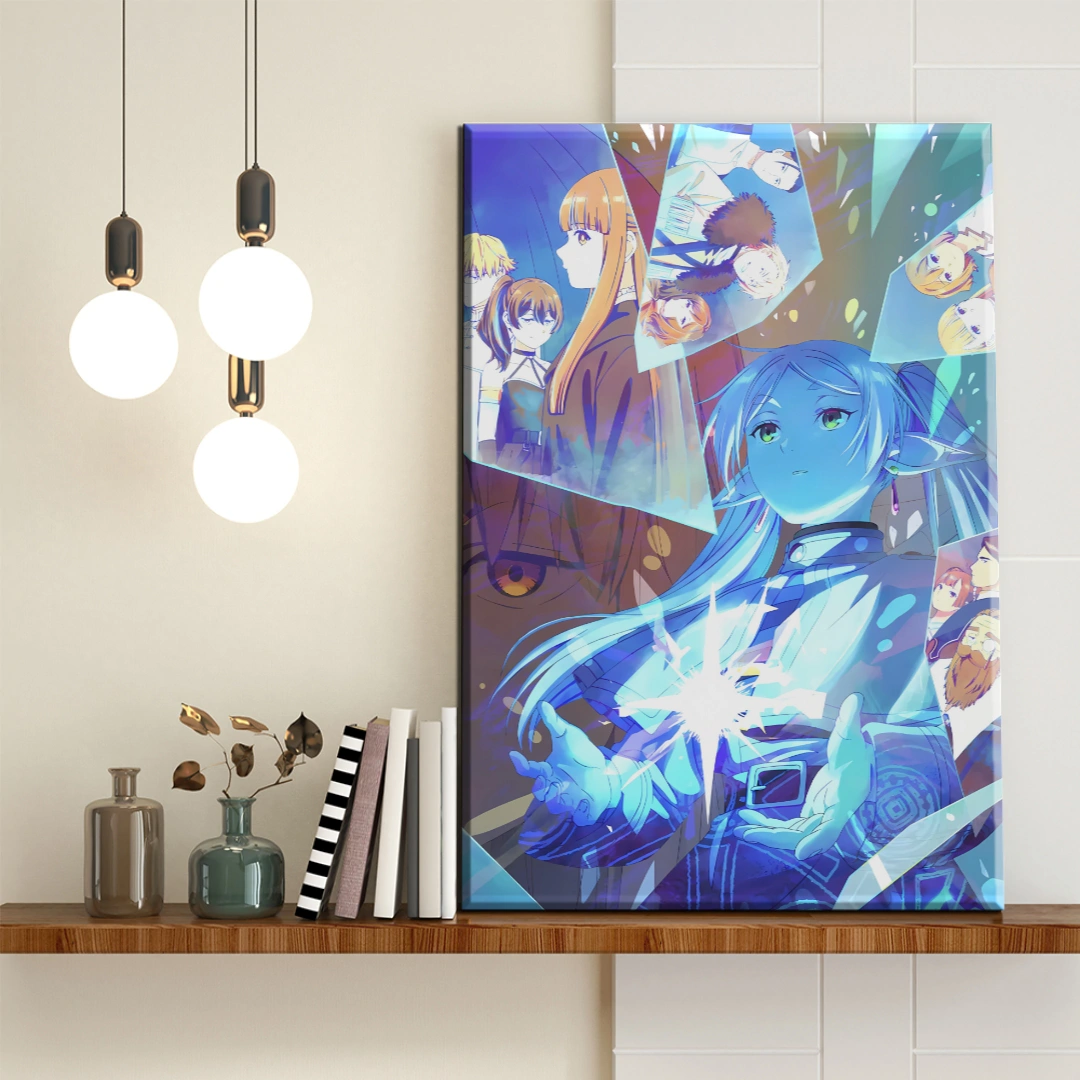 Transforma tu espacio con este impresionante cuadro decorativo de estilo anime. La composición presenta múltiples personajes en un diseño tipo collage con efectos visuales cristalinos y fragmentados que capturan la esencia de las series de animación japonesa modernas. Los tonos azules y celestes dominantes crean una atmósfera mágica y contemporánea, perfecta para fanáticos del anime y la cultura japonesa. La protagonista de cabello azul con ojos verdes emerge del centro con un brillo especial, rodeada de otros personajes en diferentes escenas. Ideal para decorar habitaciones, salas de entretenimiento o espacios personales que buscan un toque juvenil y dinámico. Esta pieza captura la energía y el dramatismo característico del anime con un estilo visual único.