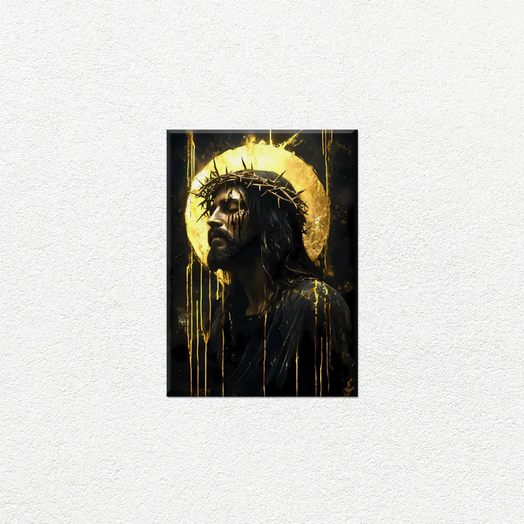 Esta poderosa representación religiosa captura la imagen de Cristo con corona de espinas en un estilo contemporáneo y dramático. El contraste entre el fondo oscuro y el resplandeciente halo dorado crea un impacto visual profundo. Los detalles incluyen lágrimas oscuras, cabello largo y barba, mientras que los efectos de pintura dorada que gotean añaden un elemento moderno y dinámico a la composición tradicional. Perfecto para espacios de reflexión, esta pieza combina devoción y expresión artística contemporánea. Ideal para quienes buscan una decoración religiosa con un enfoque visual impactante y emotivo que inspire contemplación y fe.