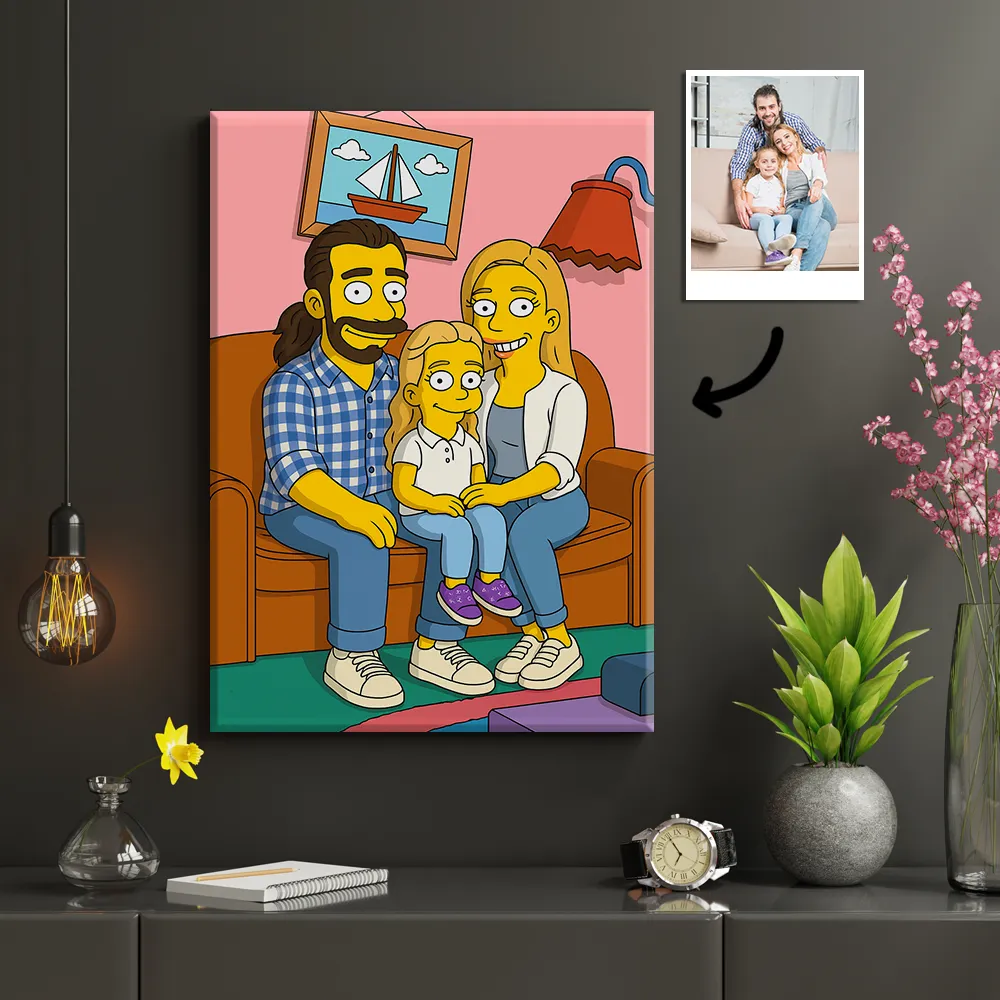 Transformamos tu foto en un cuadro personalizado con el estilo de Los Simpsons, impresión digital fijada sobre retablo de madera MDF con envío a toda Colombia.