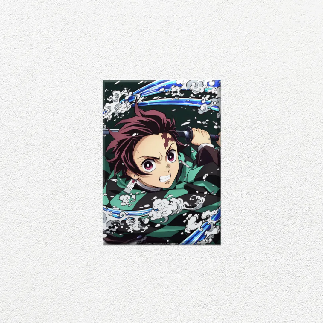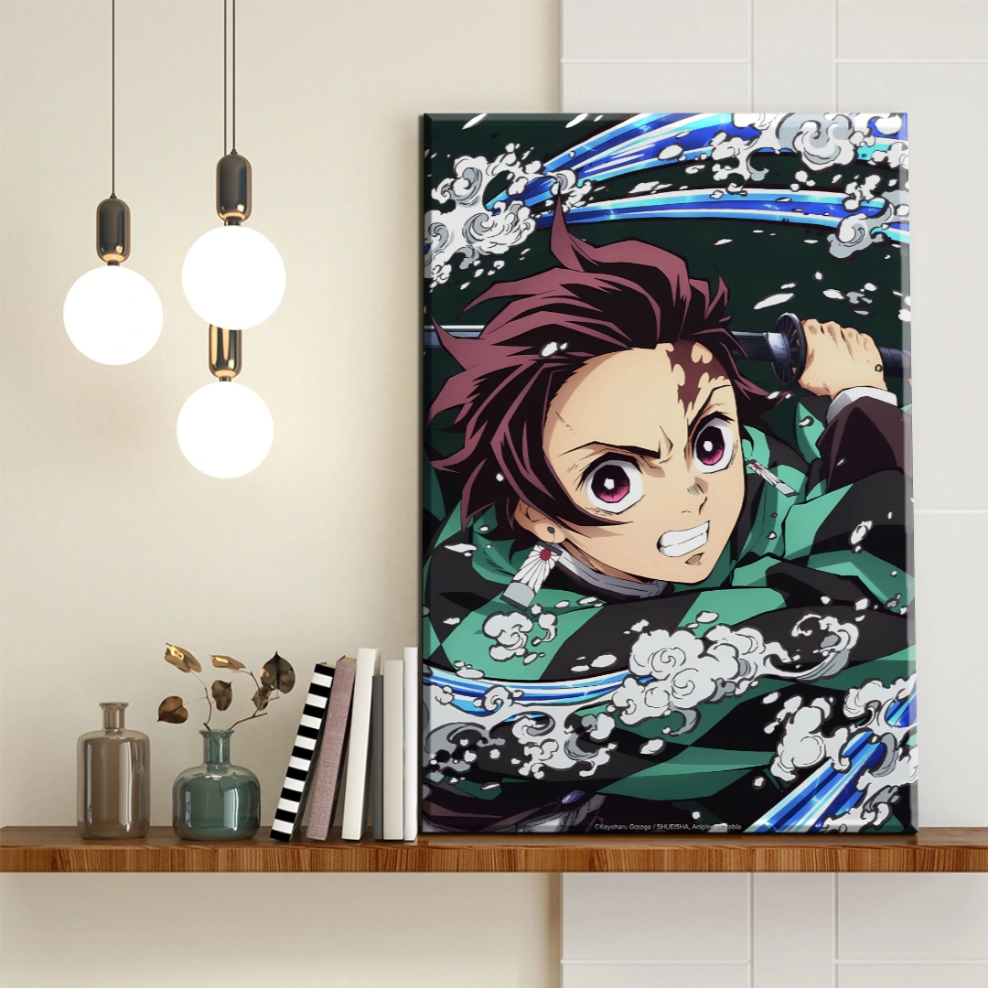 Transforma tu espacio con esta impresionante ilustración de Tanjiro Kamado, el carismático protagonista de Demon Slayer. La imagen captura la esencia del personaje en plena acción, rodeado de efectos visuales que evocan su técnica de respiración acuática. Los colores vibrantes del verde y negro de su característico haori contrastan perfectamente con los tonos azules del agua y las nubes blancas, creando una composición llena de energía y movimiento. Su expresión determinada y los detalles dinámicos hacen de este cuadro decorativo una pieza perfecta para fanáticos del anime y coleccionistas. Ideal para dormitorios, salas de entretenimiento o espacios juveniles que buscan personalidad y estilo.