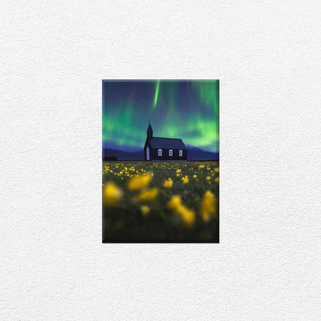 Transforma tu espacio con esta cautivadora imagen que captura la majestuosidad de las auroras boreales danzando sobre una icónica iglesia de madera negra. Esta pieza decorativa combina la serenidad de la arquitectura tradicional con la magia celestial de las luces verdes del norte, creando una atmósfera única y contemplativa. El contraste entre el campo de flores amarillas en primer plano y el cielo estrellado iluminado por las auroras genera una composición visualmente impactante. Perfect para espacios que buscan transmitir paz, misticismo y conexión con la naturaleza. Ideal para salas, estudios o dormitorios donde desees crear un ambiente relajante y sofisticado que inspire reflexión y asombro.