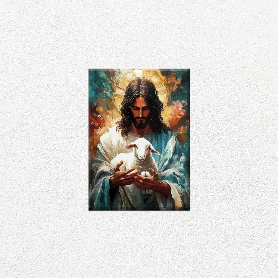 Esta hermosa representación del Buen Pastor captura un momento de ternura y protección divina. La figura central sostiene delicadamente un cordero blanco entre sus manos, simbolizando el cuidado y amor incondicional. Los tonos cálidos dorados se mezclan con azules y verdes en el fondo, creando una atmósfera celestial y serena. El halo luminoso detrás de la cabeza añade un elemento sagrado y espiritual a la composición. Las pinceladas expresivas y los colores vibrantes aportan profundidad y emotividad a esta imagen inspiradora. Perfecto para espacios de reflexión, dormitorios o salas de estar donde se busca transmitir paz y espiritualidad. Una pieza decorativa que combina devoción con estética contemporánea.