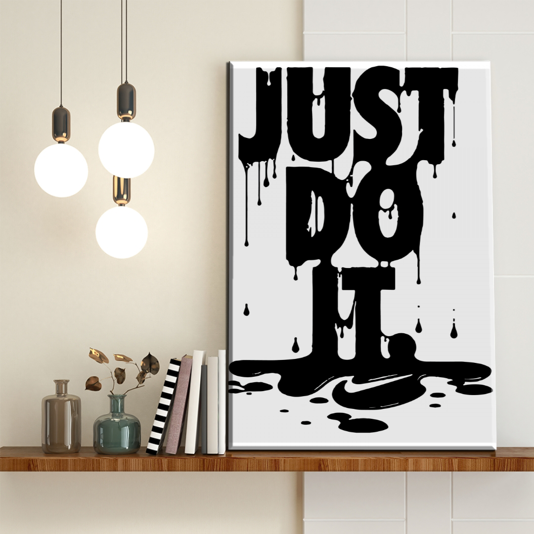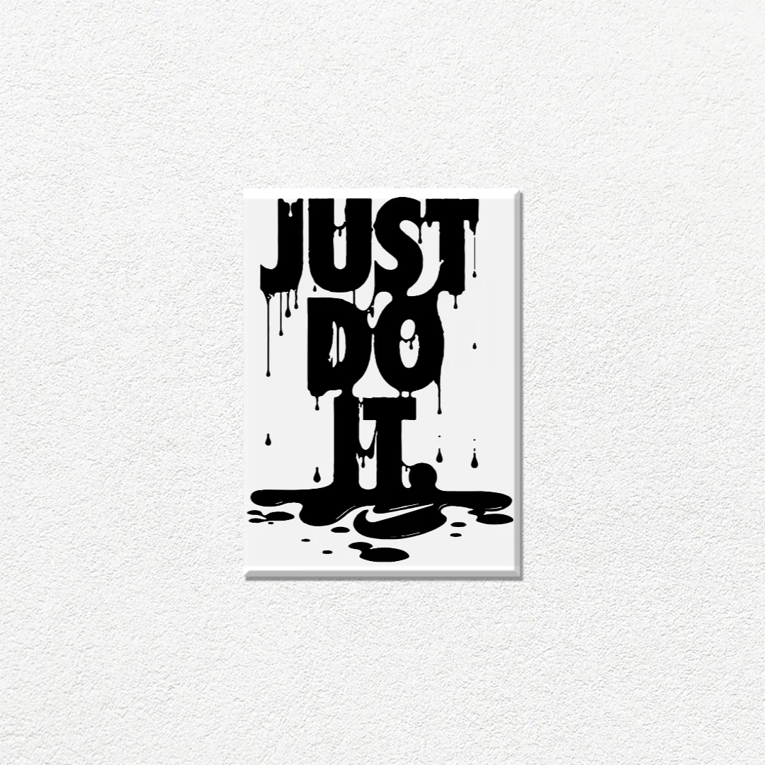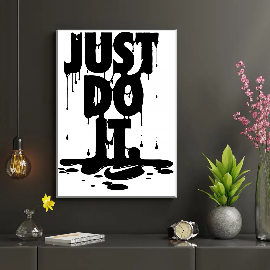 Transforma tu espacio con este diseño tipográfico impactante que captura la esencia del estilo urbano contemporáneo. La icónica frase Just Do It cobra vida con un efecto de pintura goteando que transmite rebeldía, movimiento y actitud. Perfecto para gimnasios, estudios, oficinas modernas o cualquier espacio que busque inspiración y energía motivacional. El contraste dramático en blanco y negro crea un punto focal poderoso que no pasa desadvertido. Esta pieza combina mensaje motivacional con estética callejera, ideal para quienes buscan decoración con personalidad y carácter. Un statement visual que impulsa a la acción y complementa espacios modernos, industriales o minimalistas.