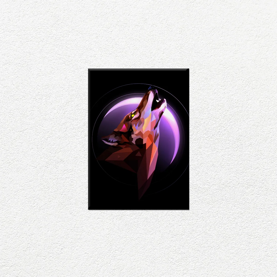 Transforma tu espacio con este impactante cuadro decorativo de un lobo aullador en estilo low-poly. El diseño presenta una composición geométrica moderna con facetas angulares en tonos cálidos de naranja, marrón y rosa, contrastando magníficamente con una luna creciente en tonos púrpura y violeta. La técnica poligonal le da profundidad y dimensión única a la figura del lobo, creando un efecto visual cautivador que captura la esencia salvaje y mística de este majestuoso animal. Perfecto para decorar salas, estudios, habitaciones o cualquier espacio que busque un toque contemporáneo y llamativo. El fondo negro resalta los colores brillantes y crea un impacto visual inmediato.