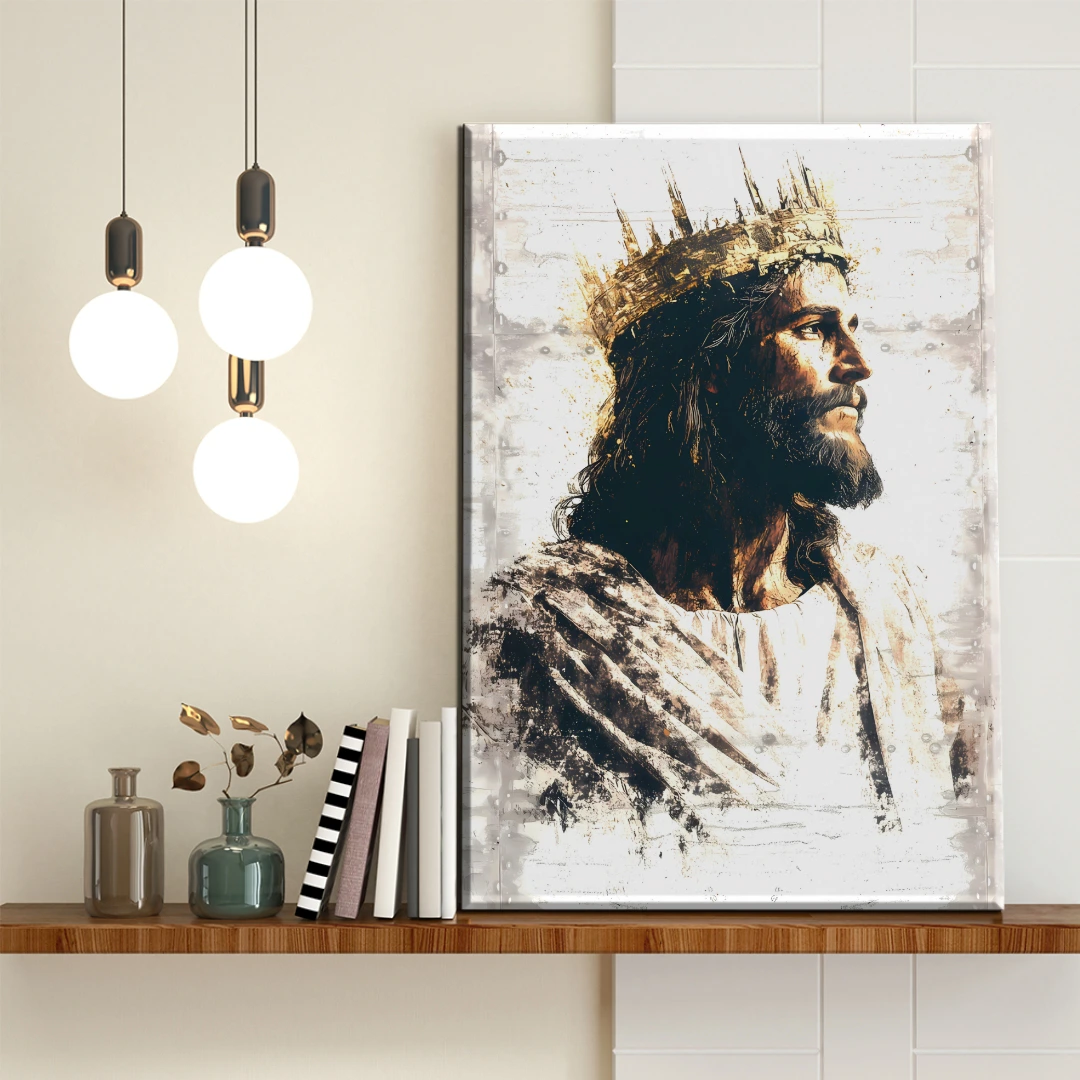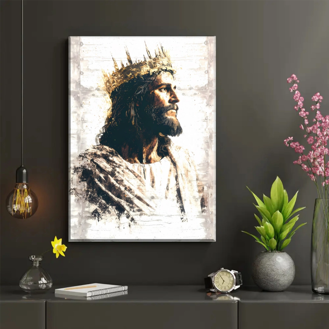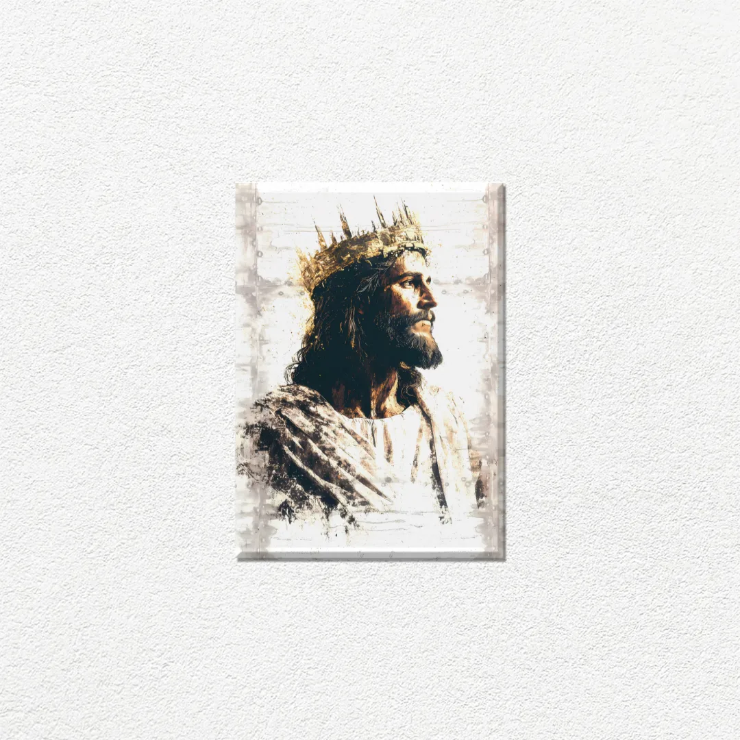 Transforma tu espacio con este imponente retrato de perfil que captura la solemnidad y majestuosidad de un rey coronado. La obra presenta una estética vintage con texturas desgastadas que aportan profundidad y carácter. Los tonos dorados de la corona contrastan elegantemente con las sombras profundas del cabello y la barba, mientras que las vestiduras claras añaden luminosidad a la composición. El efecto envejecido y las pinceladas expresivas crean una atmósfera contemplativa ideal para salones, estudios o espacios que buscan una presencia distinguida y reflexiva. Esta pieza combina realismo con técnicas pictóricas modernas para lograr un impacto visual memorable.