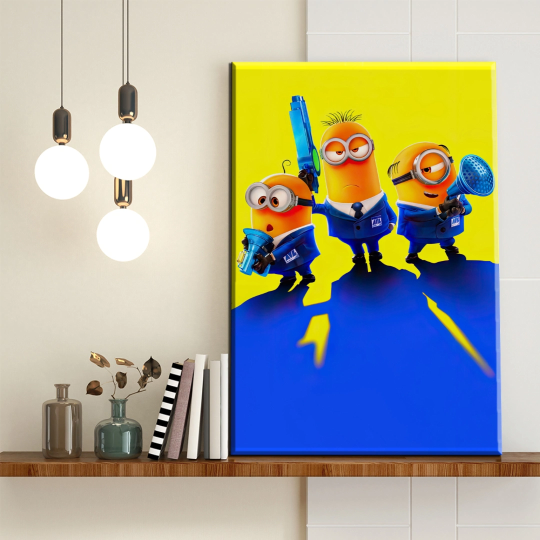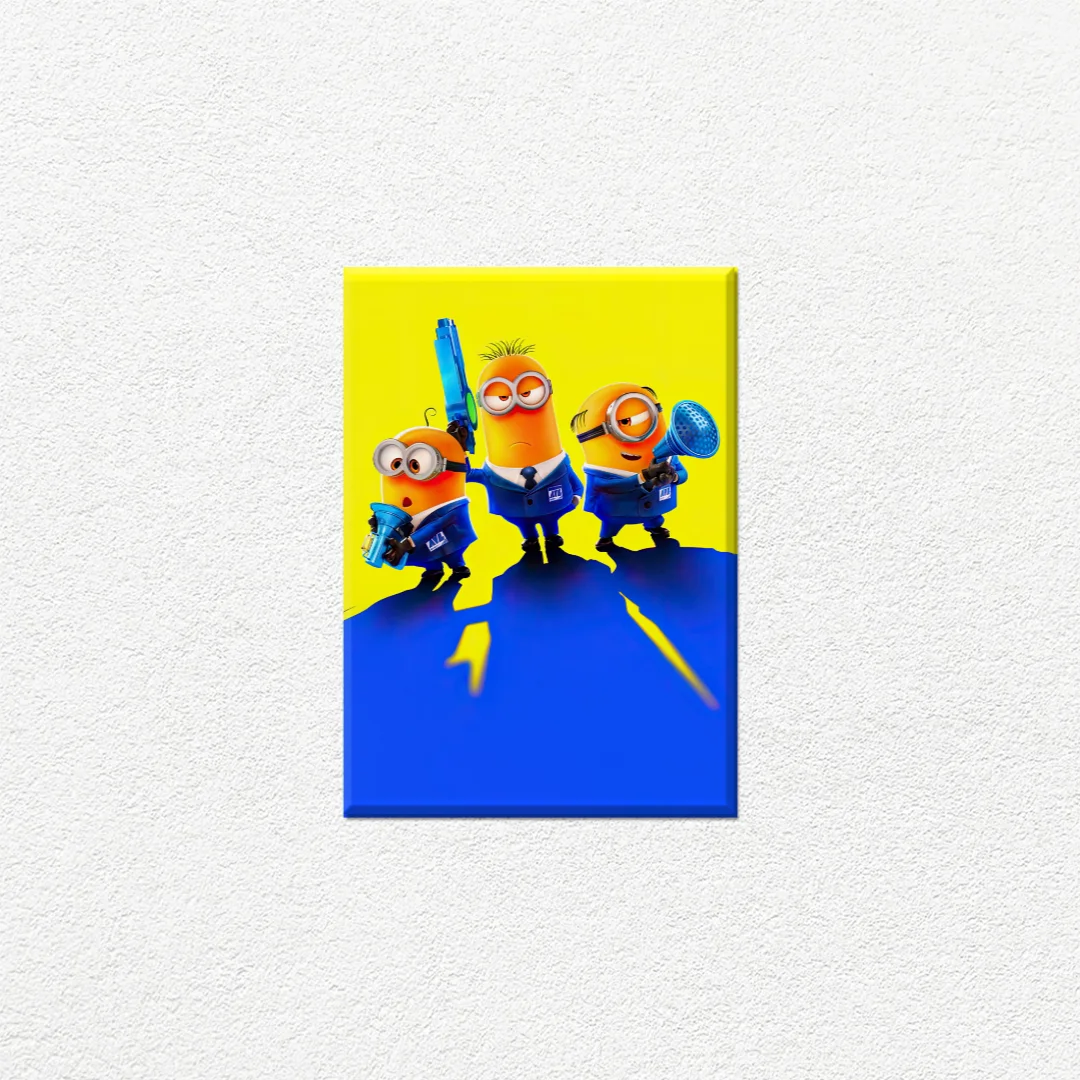 Cuadro decorativo Minions en Acción. Transforma tu espacio con estos entrañables personajes del universo Minions. Esta pieza decorativa captura a tres carismáticos Minions en sus icónicos uniformes azules, listos para la acción con sus divertidos gadgets. El vibrante fondo amarillo combinado con audaces franjas azules crea una energía dinámica perfecta para habitaciones infantiles, salas de juegos o cualquier espacio que necesite un toque alegre y divertido. Los expresivos personajes y la brillante paleta de colores aportan diversión y buen humor a cualquier pared. Ideal para fanáticos de todas las edades que aman estas adorables criaturas amarillas. Perfecta para regalar o decorar con personalidad.