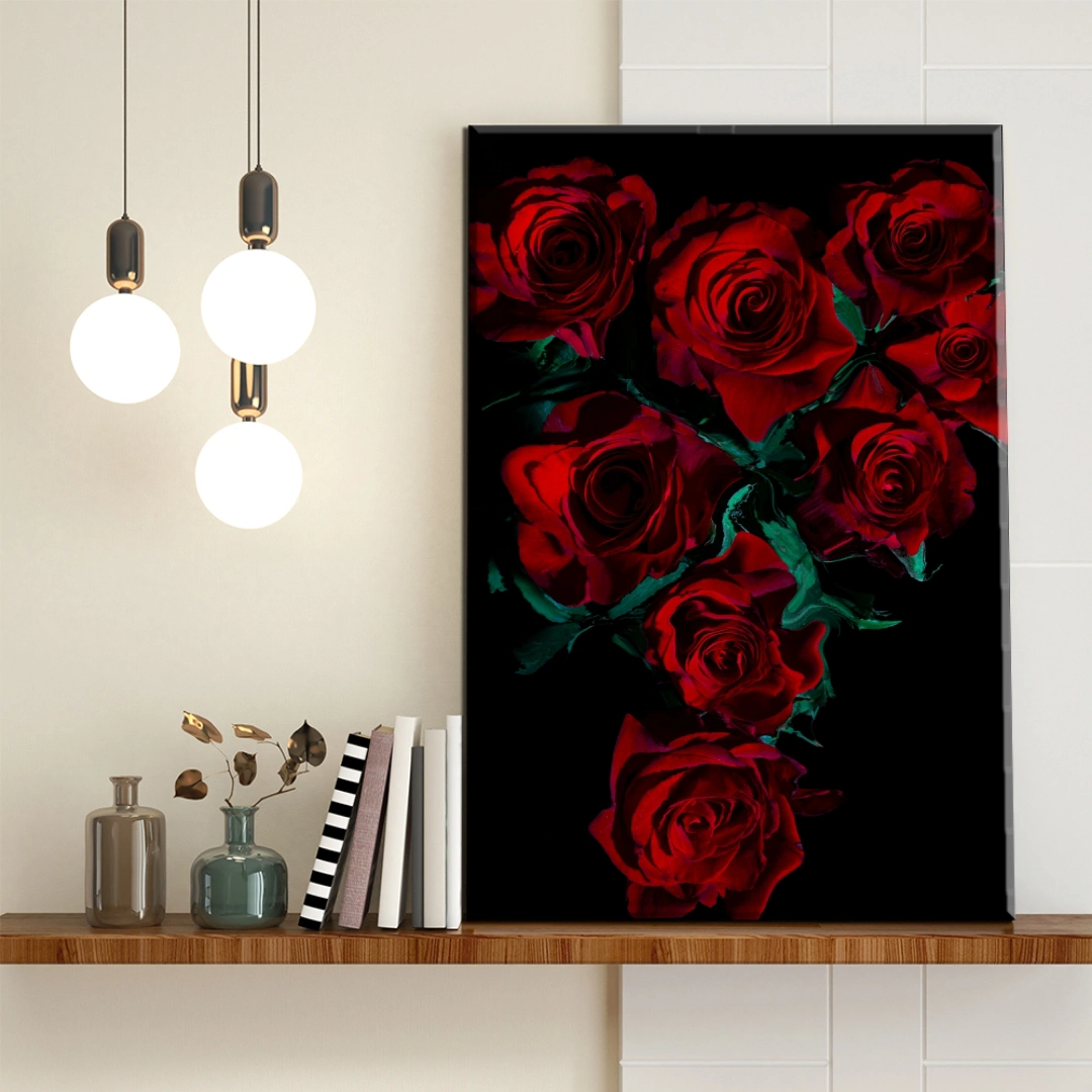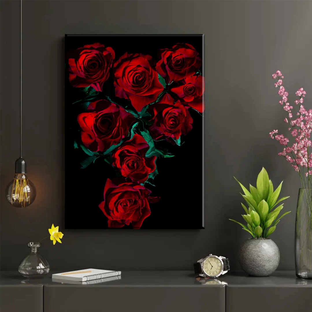 Transforma tu espacio con esta impresionante composición floral que captura la elegancia atemporal de las rosas rojas. El contraste dramático entre los vibrantes pétalos carmesí y el fondo negro profundo crea una declaración visual poderosa y sofisticada. Perfecto para dormitorios, salas de estar o espacios que busquen un toque romántico y contemporáneo. Esta pieza decorativa combina la belleza clásica de las rosas con un estilo moderno y minimalista, ideal para quienes aprecian la decoración elegante y llamativa. El juego de luces y sombras resalta cada detalle de los pétalos, creando profundidad y dimensión. Impresiones de alta calidad en vinilo adhesivo, laminado en mate o brillante y fijados en retablos de madera MDF.