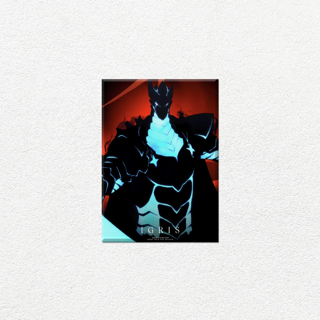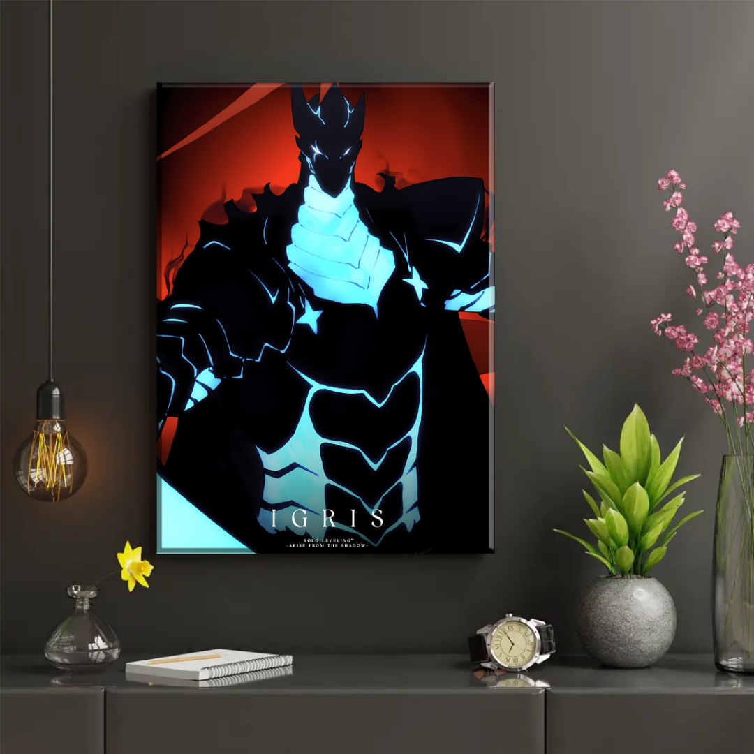 Transforma tu espacio con este espectacular cuadro decorativo de Igris, el legendario caballero de las sombras de Solo Leveling. Esta pieza captura la esencia del poderoso guerrero con una composición dramática que destaca su silueta imponente contra un fondo rojo intenso. Los detalles en tonos cyan brillante resaltan la armadura y crean un contraste visual impactante. Perfecto para fanáticos del manhwa y anime, este diseño añade un toque épico y moderno a cualquier habitación, oficina o espacio gaming. La atmósfera oscura y misteriosa refleja el poder y la lealtad de este icónico personaje.