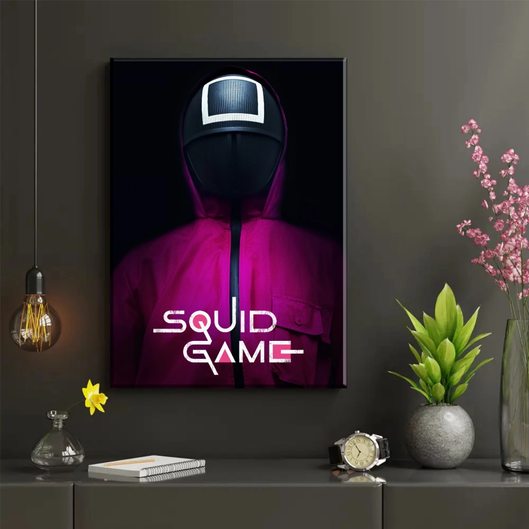 Transforma tu espacio con este impactante cuadro decorativo inspirado en la serie más popular de Netflix, Squid Game. La imagen presenta a uno de los enigmáticos guardianes con su característica máscara negra y traje rosa vibrante, capturando la esencia misteriosa y cautivadora de la serie coreana. El diseño minimalista con fondo negro profundo resalta la figura central y el logo distintivo, creando una pieza visualmente poderosa perfecta para fanáticos de la serie. Ideal para salas de entretenimiento, dormitorios modernos o espacios juveniles. Este cuadro añadirá un toque contemporáneo y urbano a cualquier ambiente, siendo un excelente punto de conversación para los amantes de las series y la cultura pop.