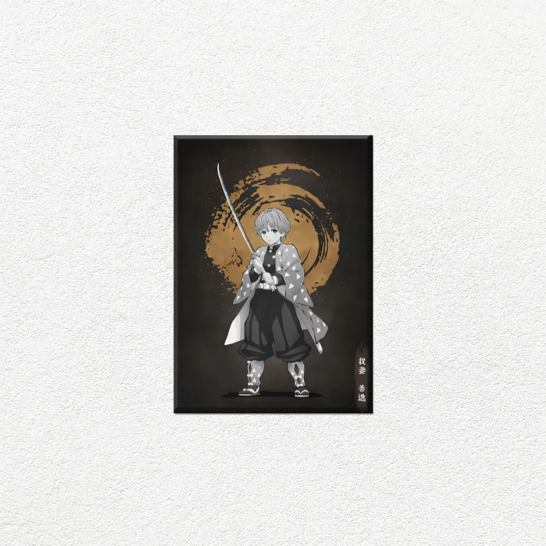 Transforma tu espacio con esta impresionante ilustración de Zenitsu Agatsuma, el espadachín del trueno de Demon Slayer. El diseño presenta al personaje en una pose dinámica de combate, empuñando su katana con determinación. El estilo monocromático en escala de grises contrasta perfectamente con el llamativo fondo circular dorado que evoca su técnica de Respiración del Trueno. Los detalles del haori con patrón de triángulos y la expresión concentrada del personaje capturan la esencia de este querido guerrero demon slayer. Perfecto para fanáticos del anime que buscan decorar su habitación, sala de entretenimiento o espacio personal con un diseño que combina acción y estilo. Ideal para coleccionistas y seguidores de Kimetsu no Yaiba.